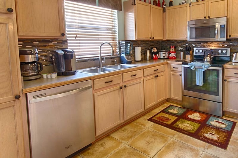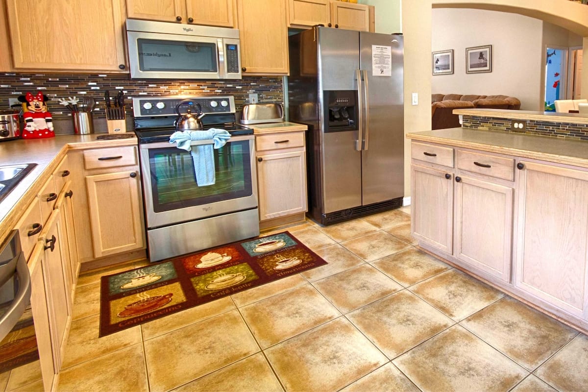 Double Door Refrigerator Freezer with Ice & Water Dispenser | Electric Range | Dishwasher | Keurig Coffee Maker | Filter Coffee Maker | Food Mixer | Crockpot | Blender | Stainless Steel Cookware | 4 Slice Toaster | Garlic Press | Potato Masher | Peelers | Good Quality Knives | Bottle Opener | Cutting Boards | Temperature Gage | Mixing Bowls | Storage Containers | Paper Towels | Plastic-ware | Trash Bags | Dishwasher Tabs | Dish Detergent | Cleaning Products | Aluminum Foil | Plastic Wrap | Silicone bakeware